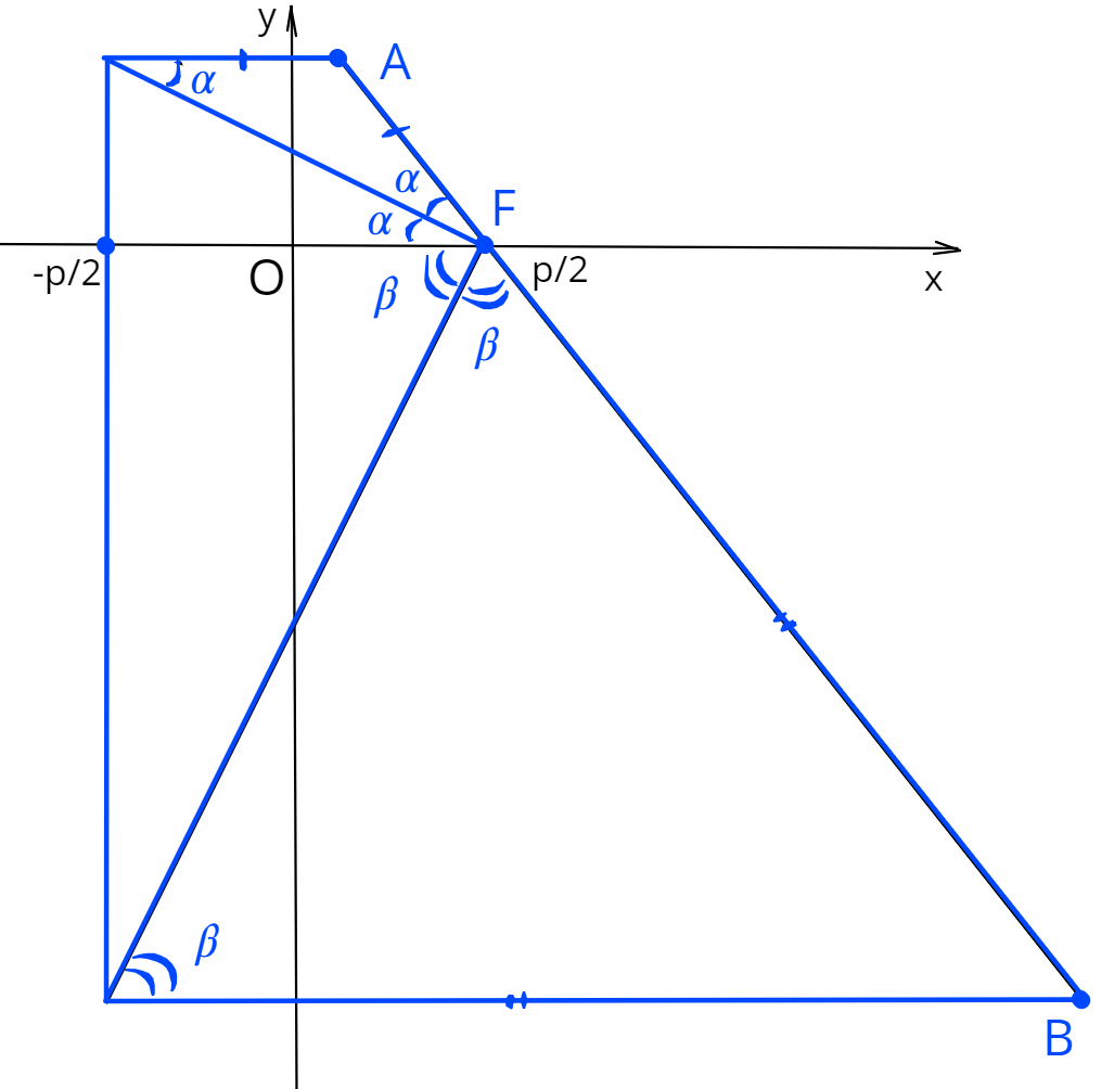 g) Докажите, что сумма \(\frac{1}{|AF|}+\frac{1}{|BF|}\) является величиной постоянной для хорды \(AB,\) проходящей через фокус параболы, и не зависит от координат точки \(A.\) Чему равна эта сумма?